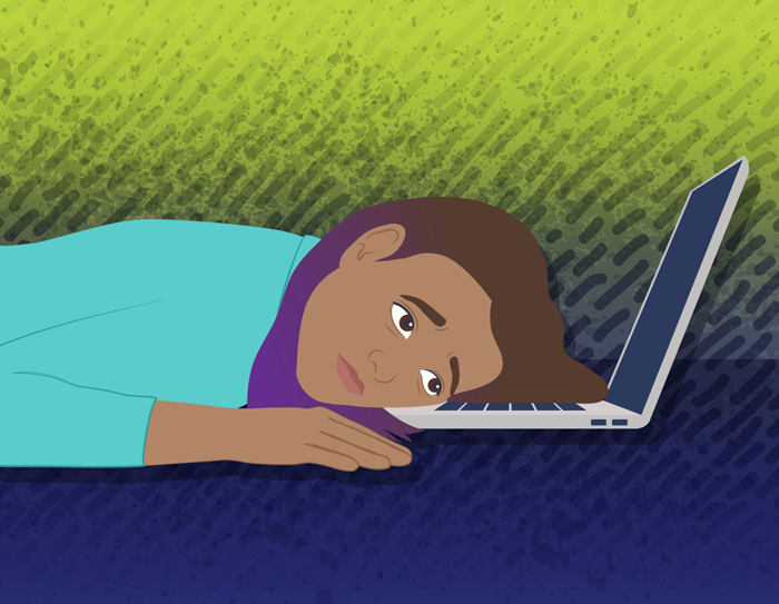 Young person laying face down on a laptop keyboard looking stressed