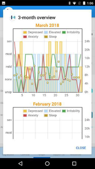 Very professional and usable - graphically and mechanics-wise. It is very specific to bipolar disorder. The questions asked seem to be taken from a standardised measure for bipolar, but provides good trackers. Would definitely recommend this app.