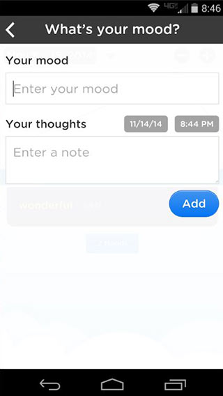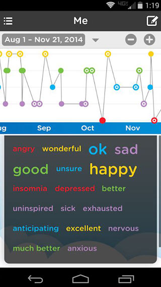 Graph your moods on the fly. Track as little or as often as you want (mood-swings? no problem!), whenever you want (at home, on the go, and even without Internet!), and look back to see your moods over weeks, months, and years to learn about yourself and live better!