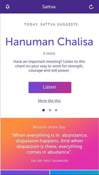 Sattva is a mindfulness app which provides users with mindfulness-based activities such as meditations, chants, music and the ability to create their own library of meditations. It also incorporates social media elements and users can make "friends", join "lounges" and see a "live feed" of other users' activities. There are also gamified elements such as "trophies" which can be unlocked by users who have completed activities.