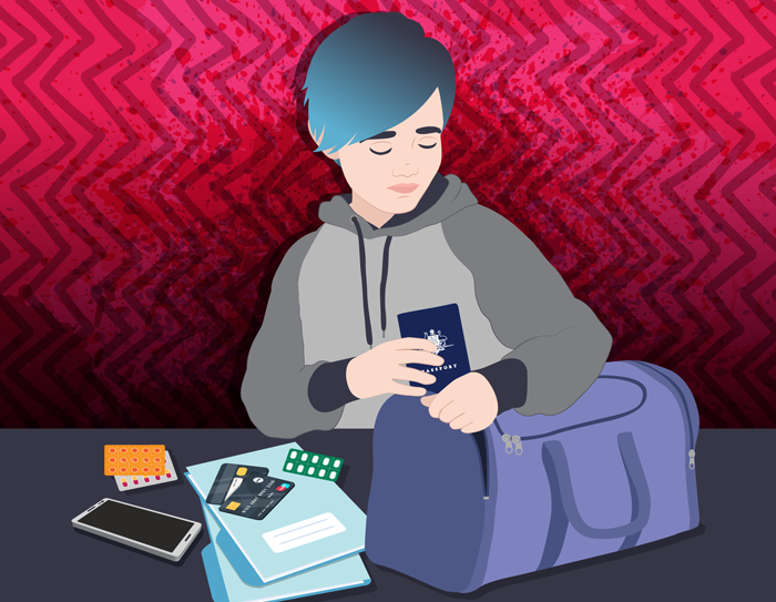 Pack a bag of essentials (medications, important docs, access to money) and leave it somewhere safe where it can’t be accidentally found, such as a friend’s house