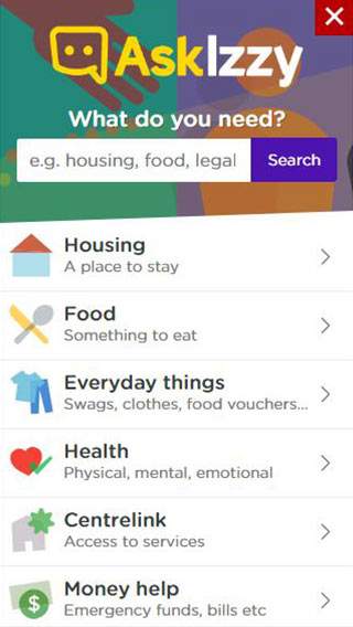 When you’re looking for support, Ask Izzy can help you to find the services you need, right now and nearby. It is free and anonymous, and you can search over 350,000 services to find housing, meals, healthcare, counselling, legal advice, addiction treatment and a whole lot more.