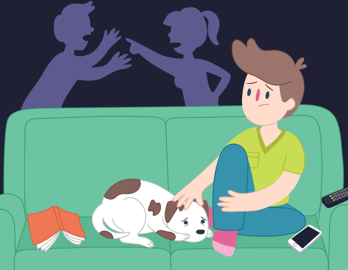 Sad boy and his dog on couch, parents fighting in background