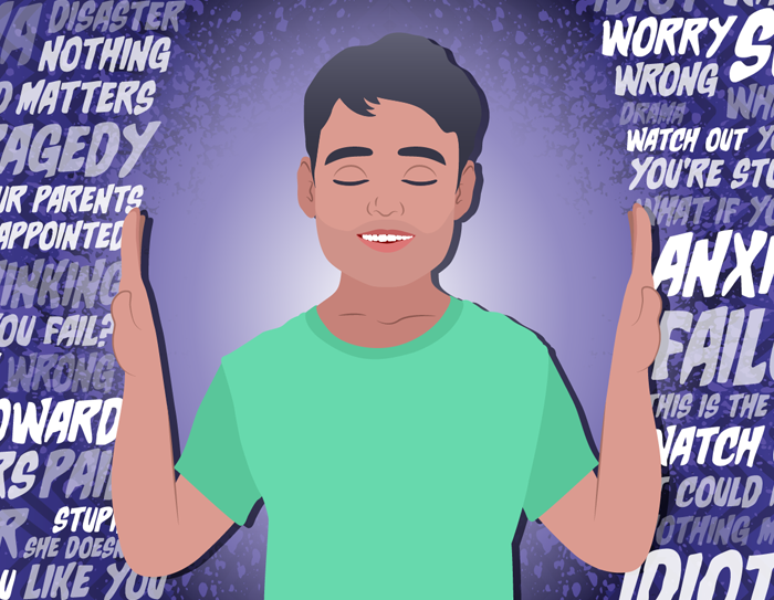 Teen pushing aside anxious thoughts represented by anxiety related words
