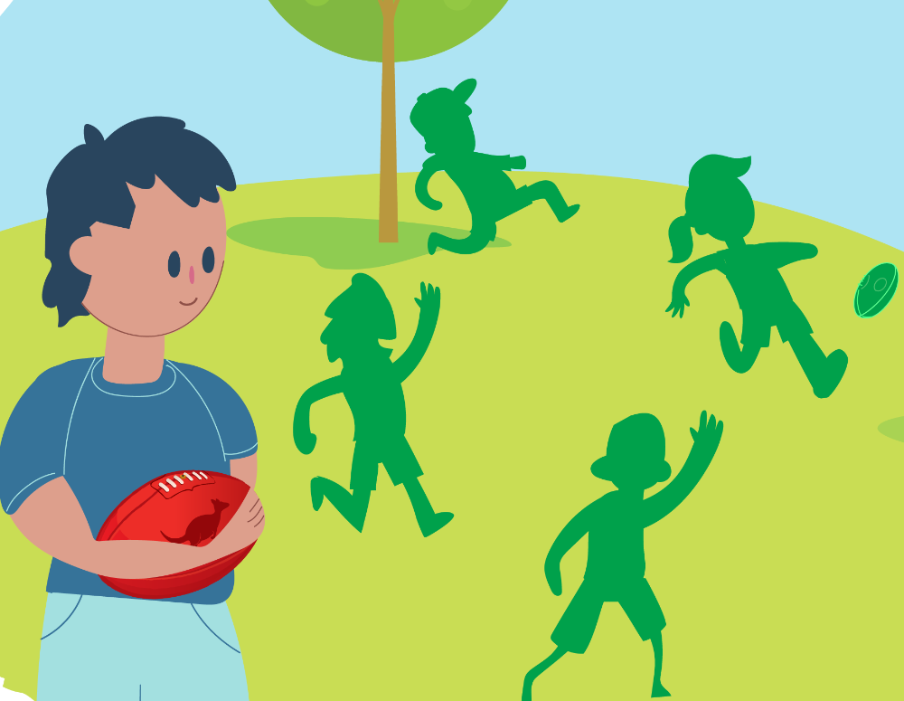 Boy with an AFL ball looking at other kids playing