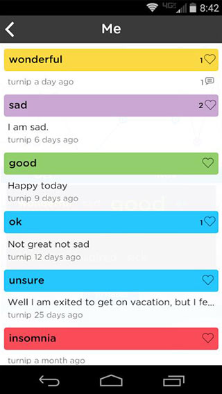 The app follows a very basic design and while not entirely ugly, lacks visual appeal. The mood tracking features chart the data in a satisfactory way (line graph). The app also has a feature titled "Everyone" which is a feed of all users current moods. Generally I found this feature to be mostly positive and it was reassuring to see there was a fair assortment of positive and negative "moods". The app also allows the user to select a anonymous name to use on their account. Although the visual design is lacking, overall I would use this app on a casual basis.