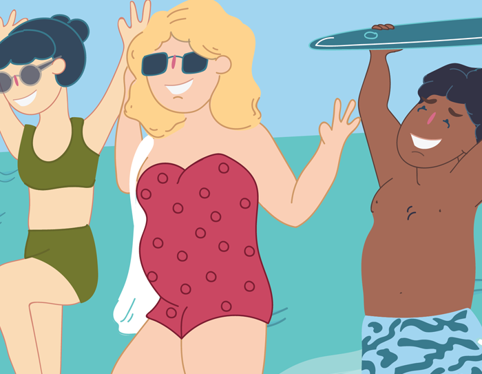 Three young people at the beach, with different body types and a sign saying 'every body is a beach body'